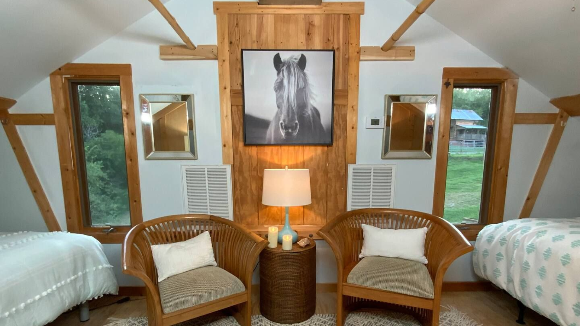 A renovated barn, now beloved retreat center, surrounded by horses, in the rolling hills with views of the Naugatuck mountains. This is the perfect rustic getaway to heal, connect, and slow down. The lodge contains 11 private sleeping spaces with queen size beds with pillow top mattresses, 4 shared bathrooms, as well as spacious common areas, a yoga deck, and an outdoor fire pit.
